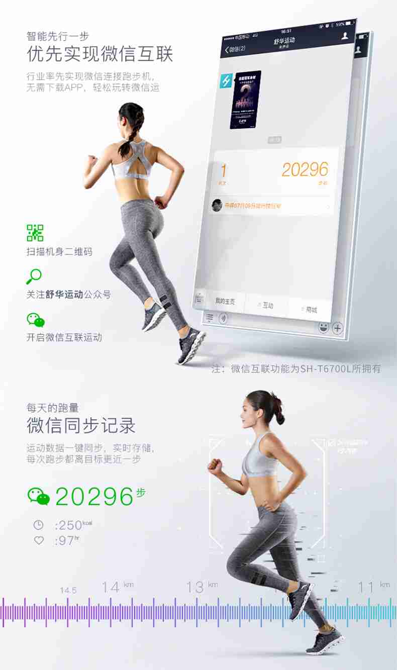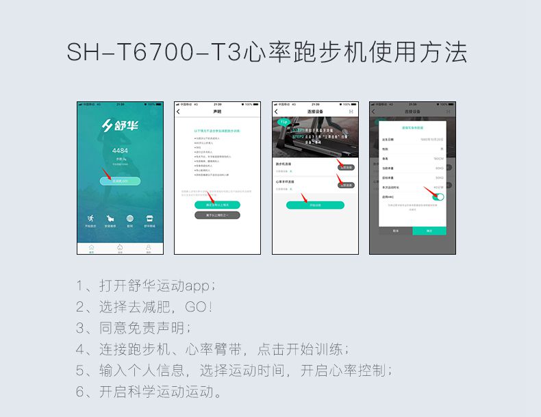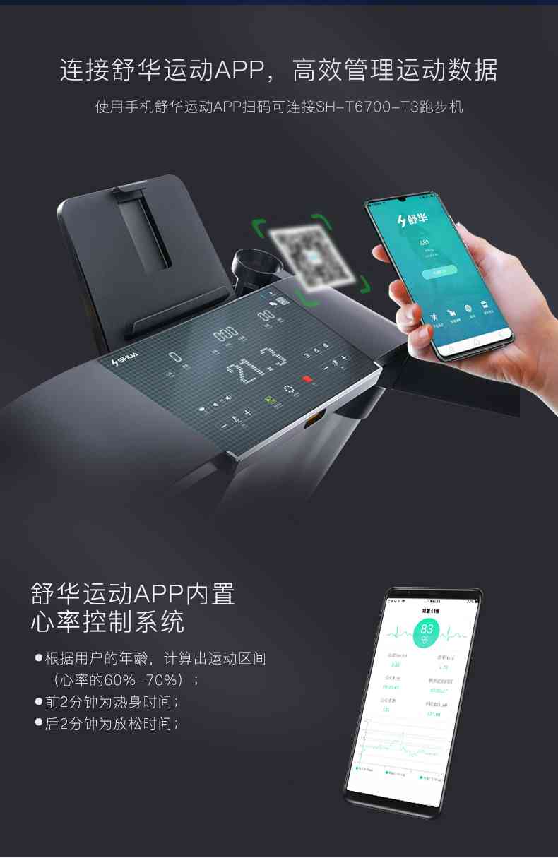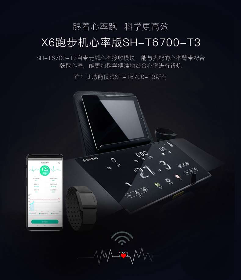 SH-T6700-T3跑步机为了帮助用户进行更加科学有效的运动,搭载南宫NG28APP连接心率臂带实现心率控制,通过监测运动心率从而实现科学运动。