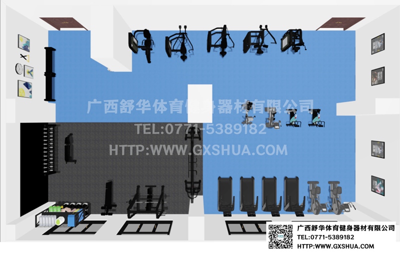 此方案要求面积小于182m²,适用于企事业单位、酒店会所、楼盘社区、工作室、学校等健身场所,能满20-30人同时健身使用。(方案根据场地空间大小、预算、产品需求等进行配置仅为启发性参考)