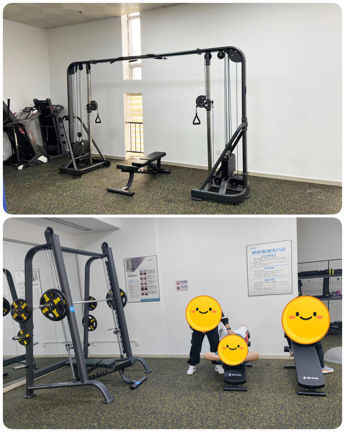 自由力量区域配置十字架拉力训练器(大飞鸟)、史密斯机训练架、多重可调节练习椅、哑铃套组、腹肌板、拳击沙袋。多肌群协同训练,可以通过不同的练习动作,如深蹲、硬拉、卧推等,使各个肌群得到充分的训练。这种全身性的锻炼方式有助于促进肌肉的整体发展,提高身体的协调性和平衡性,提高核心稳定性,提升爆发力和耐力,自由重量训练涉及到大量的肌肉群,训练时会消耗大量的能量。因此,经常进行自由重量训练可以增加新陈代谢率,使人们在休息时也能够燃烧更多的脂肪。