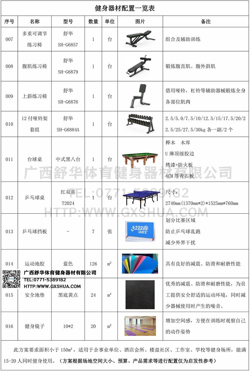 150m²企事业单位健身房根据客户需求及预算,有氧器材区域配置南宫NG28跑步机、椭圆机、动感单车,多元化的有氧器材能够有效提升心肺功能;力量器械配置综合训练器,可拓展多种训练方法,提供针对性训练、多种组合等训练方式,全方位激活身体机能。自由力量区域配置哑铃套组、腹肌训练器等满足多样化训练需求,促使健身训练更丰富。单位健身房配置台球桌、乒乓球桌,为员工的业余生活增添了乐趣和选择。与传统的健身器材锻炼相比,台球、乒乓球具有更强的娱乐性和趣味性,能够吸引更多员工参与到健身活动中来,提高健身房的使用率,让员工在工作之余有更多放松身心的方式。