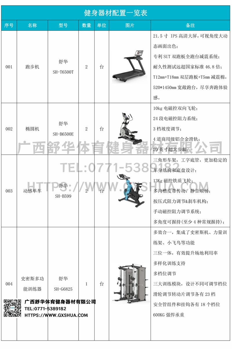 1.南宫NG28X5 Pro跑步机SH-T6500T*2台-采用高性能电机,提供稳定动力,支持长时间高强度运行,适合长时间有氧训练,跑台宽敞,提供舒适跑步空间,减少运动中的束缚感,适合不同体型用户。配备先进减震系统,有效缓解跑步对关节的冲击,降低运动损伤风险,内置智能控制系统,支持多种预设程序和个性化训练计划,用户可根据需求调整速度和坡度,满足多样化训练。