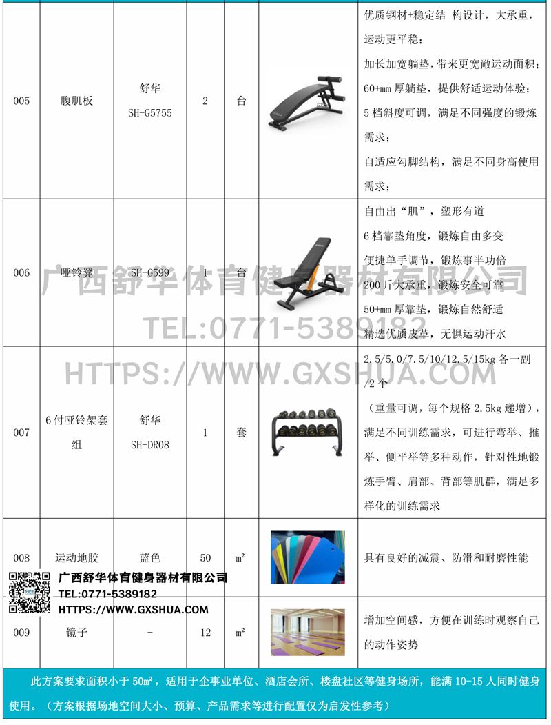 此方案要求面积小于50m²,适用于企事业单位、酒店会所、楼盘社区等健身场所,能满10-15人同时健身使用。(方案根据场地空间大小、预算、产品需求等进行配置仅为启发性参考)