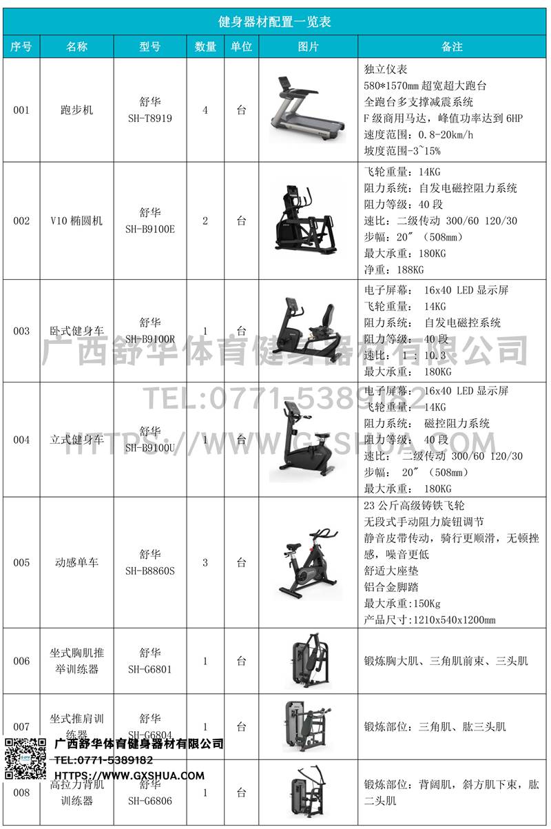 1.南宫NG28V9跑步机SH-T8919*4台-独立仪表-简洁大气,全新外观设计,健康运动新选择;心率监测功能,可通过手握心率、无线心率带等不同方式实时采集心率数据;580*1570mm超宽超大跑台-跑感舒适,跑台整体安全稳定;全跑台多支撑减震平台,保证跑台超强支撑力,达到180kg支撑,满足专业健身房需求。F级商用马达-超强马达,AC 3.0HP 交流,峰值功率达到6HP,F级商用品质。速度范围达到0.8-20km/h;V9跑步机可实现跑台扬升功能,坡度范围-3~15%,满足客户不同的锻炼需求。