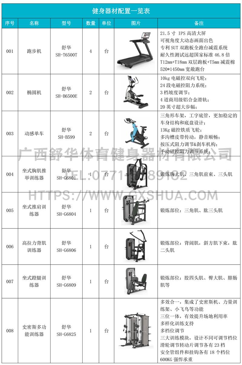 主要配置史密斯多功能训练器、多重可调节练习椅、10付哑铃套组、哑铃凳、腹肌训练器(各1台),可以实现对不同肌肉群的针对性训练,满足肌肉训练需求,全方位激活身体机能。